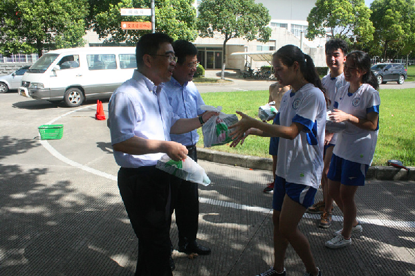 期间我校党委书记宋宝儒,党委副书记、副校长、工会主席吴沛东在工会常务副主席沈晓峰,工会副主席、妇委负责人顾爱怡等陪同下于7月31号上午,送来慰问,并提出要合理科学训练,鼓励队员要努力拼搏,为学校也为自己争得荣誉!