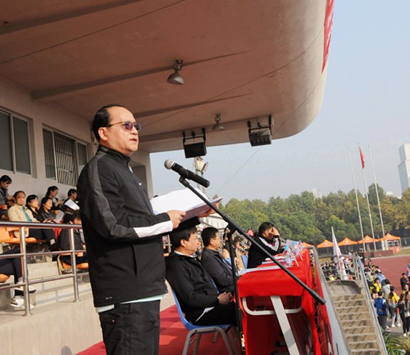校长俞涛在开幕式上致辞,他代表学校向本届运动会的举办表示热烈祝贺,向为运动会的组织、筹备付出辛勤劳动的全体师生表示衷心感谢。俞涛在致辞中说,在中国特色社会主义进入新时代的背景下,体育对国家富强至关重要,对人的全面发展也具有不可替代的重要作用,通过参加体育锻炼,能培养竞争力、增强凝聚力、锻炼意志力。近年来,学校围绕“职业导向的高等教育”办学定位,开展了一系列有价值、有特色的探索和实践,并取得了诸多成绩。仅2016-2017学年,我校就组织了300多名非专业学生参加龙舟国际华人邀请赛、全国大学生运动会、全国大学生毽球锦标赛等重要赛事,获得了1个国际级单项、42个国家级单项、68个市级单项竞赛奖项。希望大家在本届运动会中发扬“更高、更快、更强”的奥林匹克精神,赛出竞技水平、赛出道德风尚、赛出青春风采。